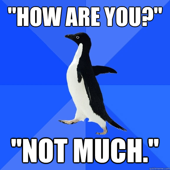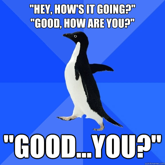"hey, how's it going?" "good, how are you?" "good...you?"