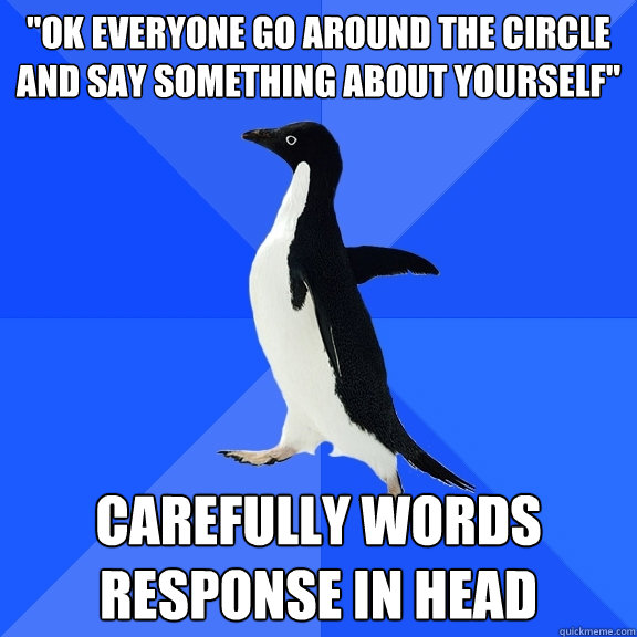 "ok everyone go around the circle and say something about yourself" carefully words response in head