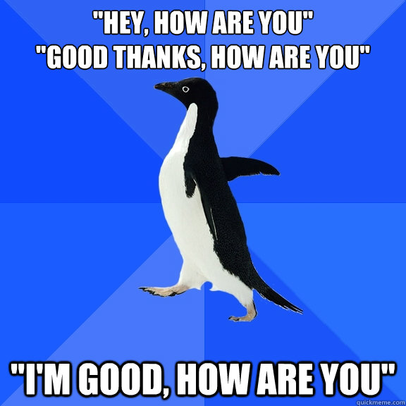 "Hey, how are you" "Good thanks, how are you" "I'm good, how are you"