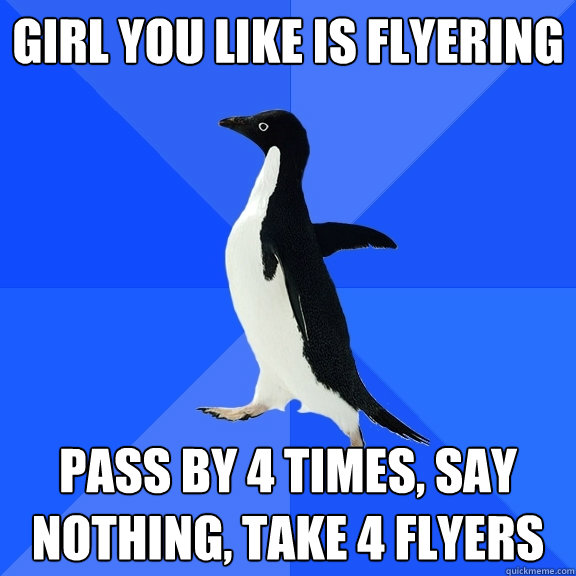 girl you like is flyering pass by 4 times, say nothing, take 4 flyers