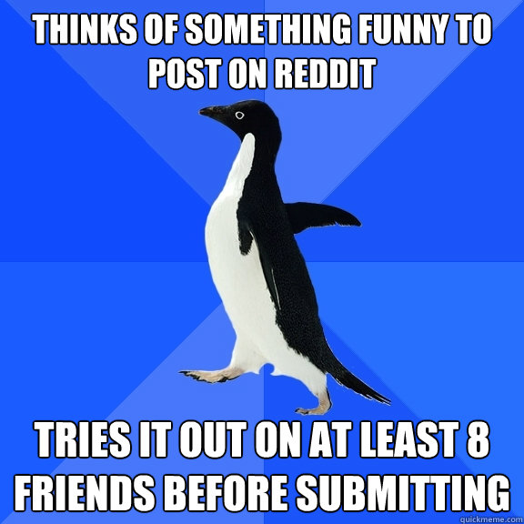 Thinks of something funny to post on reddit tries it out on at least 8 friends before submitting