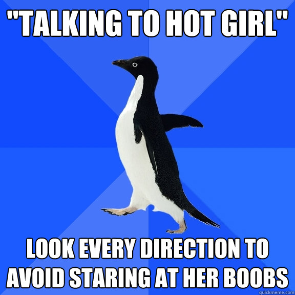 "Talking to hot girl" look every direction to avoid staring at her boobs