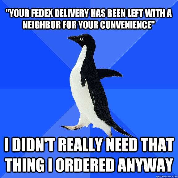 "YOUR FEDEX DELIVERY HAS BEEN LEFT WITH A NEIGHBOR FOR YOUR CONVENIENCE" I DIDN'T REALLY NEED THAT THING I ORDERED ANYWAY