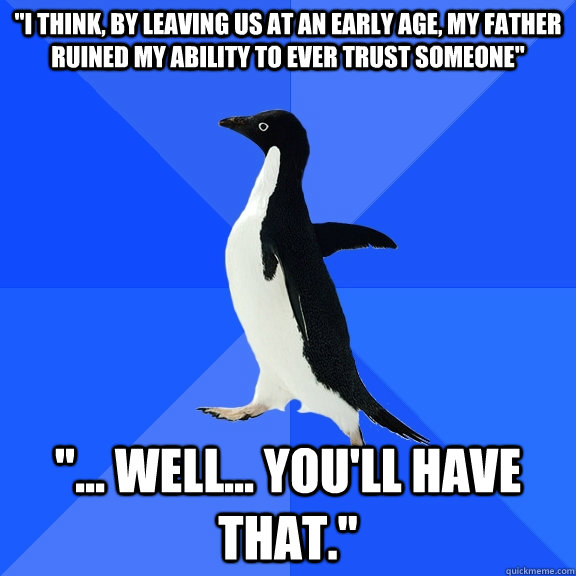 "I think, by leaving us at an early age, my father ruined my ability to ever trust someone" "... Well... you'll have that."