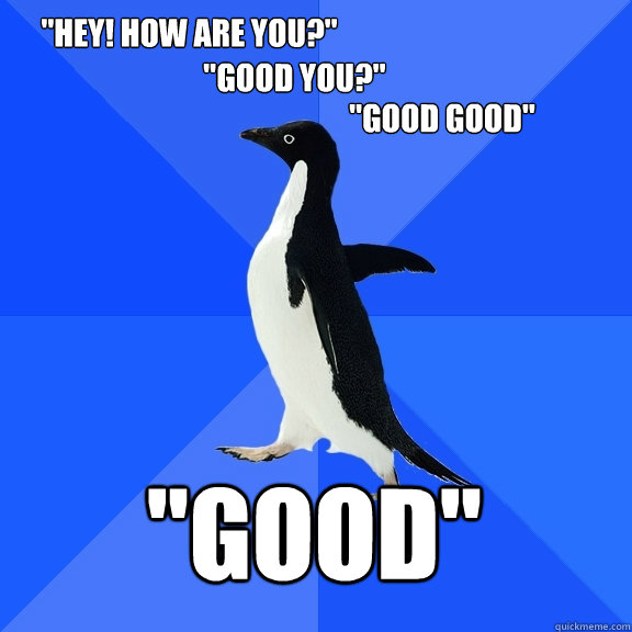 "Hey! how are you?" "Good Good" "Good you?" "GOOD"