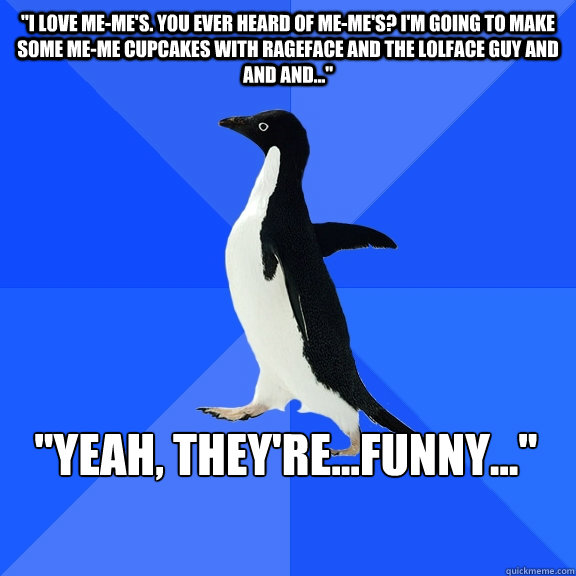 "I love me-me's. You ever heard of me-me's? I'm going to make some me-me cupcakes with rageface and the lolface guy and and and..." "Yeah, they're...funny..."