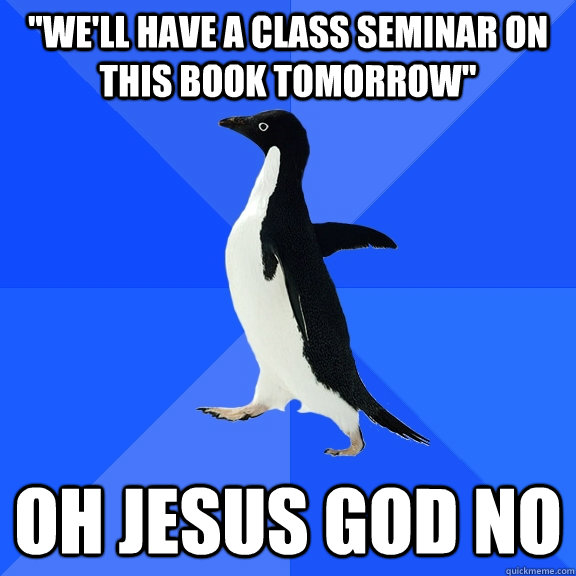 "we'll have a class seminar on this book tomorrow" oh jesus god no