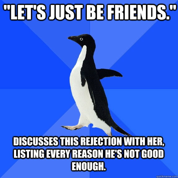 "Let's just be friends." Discusses this rejection with her, listing every reason he's not good enough.