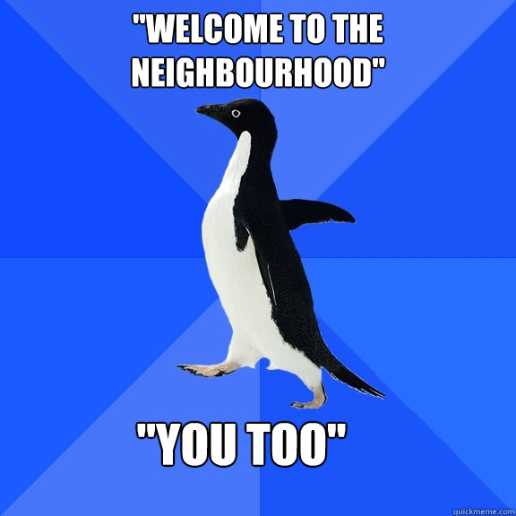 "Welcome to the neighbourhood" "You too"