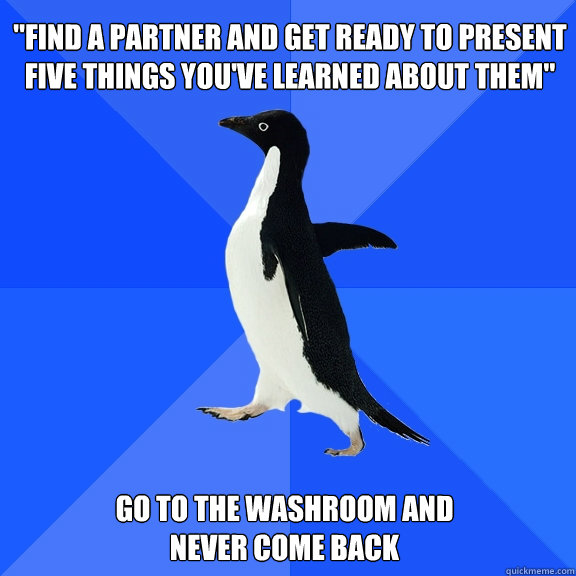 "Find a partner and get ready to present five things you've learned about them" Go to the washroom and never come back