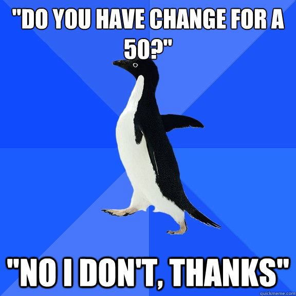 "Do you have change for a 50?" "No I don't, thanks"