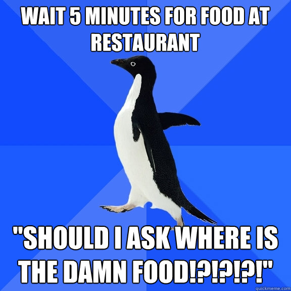 "SHOULD I ASK WHERE IS THE DAMN FOOD!?!?!?!" wait 5 minutes for food at restaurant