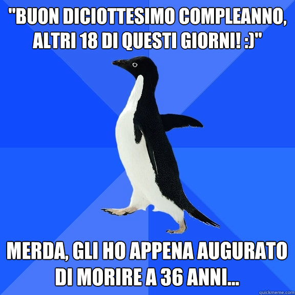 "buon diciottesimo compleanno, altri 18 di questi giorni! :)" merda, gli ho appena augurato di morire a 36 anni...