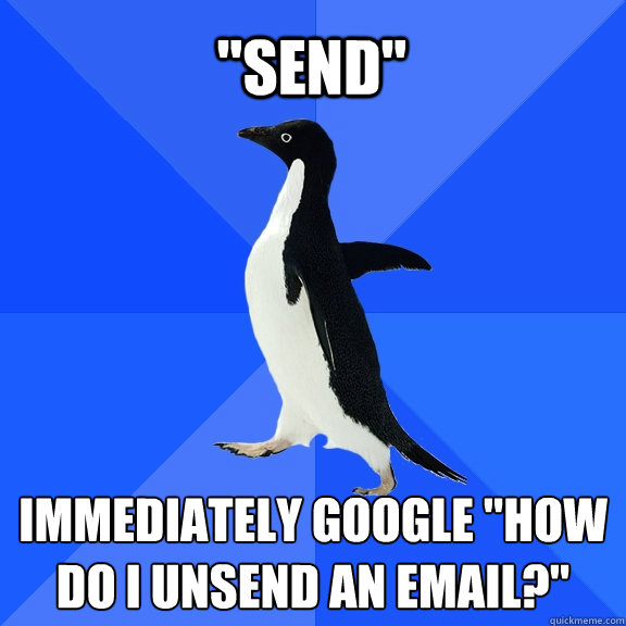 "Send" immediately google "How do I unsend an email?"