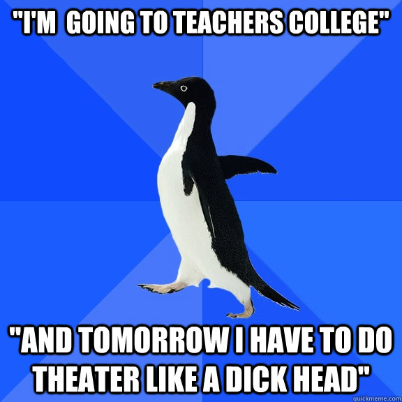 "i'm going to teachers college" "And tomorrow I have to do theater like a dick head"