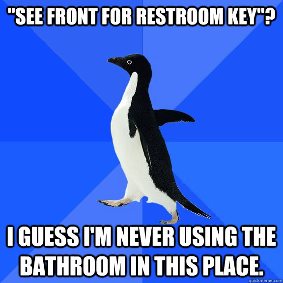 "See front for restroom key"? I guess I'm never using the bathroom in this place.