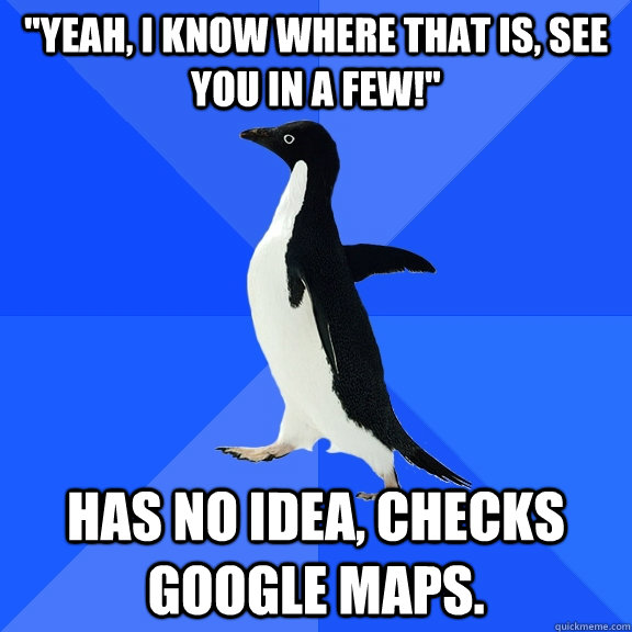 "Yeah, I know where that is, see you in a few!" Has no idea, checks Google maps.