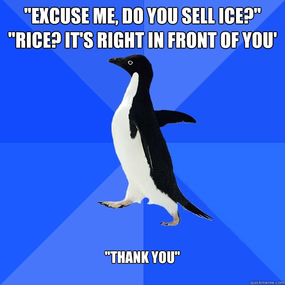 "Excuse me, do you sell ice?" "Rice? It's right in front of you' "Thank you"