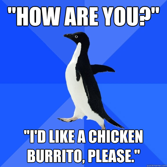 "How are you?" "I'd like a chicken burrito, please."