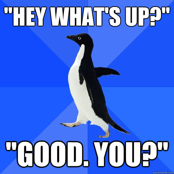 "Hey what's up?" "Good. You?"