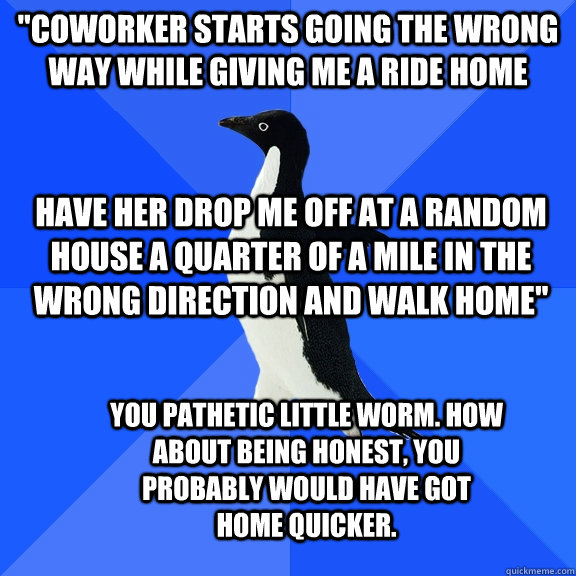 "coworker starts going the wrong way while giving me a ride home have her drop me off at a random house a quarter of a mile in the wrong direction and walk home" You pathetic little worm. How about being honest, you probably would have got home quicker.