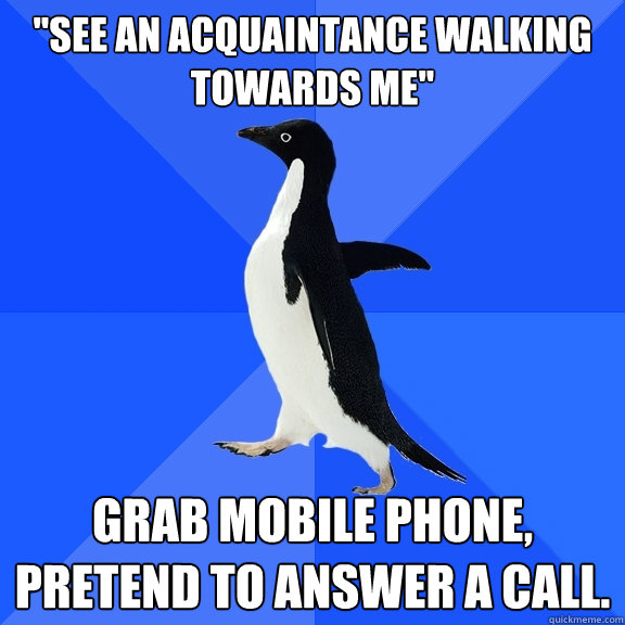 "See an acquaintance walking towards me" Grab mobile phone, pretend to answer a call.