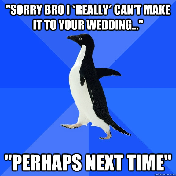 "Sorry bro I *really* can't make it to your wedding..." "Perhaps next time"