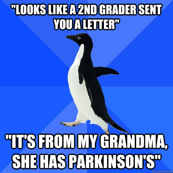 "Looks like a 2nd Grader sent you a letter" "it's from my grandma, she has parkinson's"