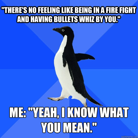 "there's no feeling like being in a fire fight and having bullets whiz by you." Me: "yeah, i know what you mean."