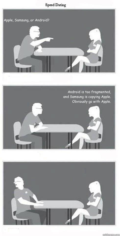 Apple, Samsung, or Android? Android is too fragmented, and Samsung is copying Apple. Obviously go with Apple. She's the one!