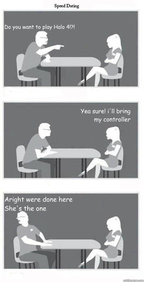 Do you want to play Halo 4!?! Yea sure! i'll bring my controller Aright were done here She's the one