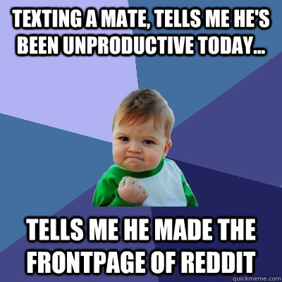 Texting a mate, tells me he's been unproductive today... Tells me he made the frontpage of reddit