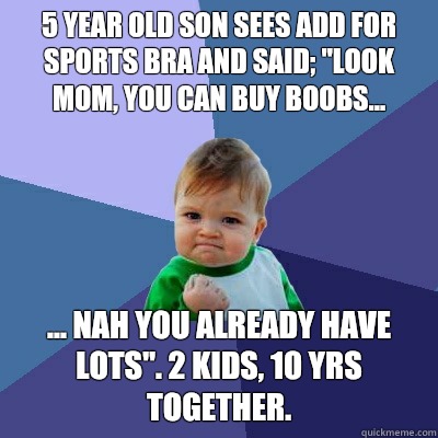 5 year old son sees add for sports bra and said; "Look mom, you can buy boobs... ... nah you already have lots". 2 kids, 10 yrs together.