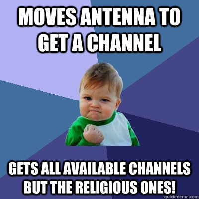 Moves antenna to get a channel gets all available channels but the religious ones!