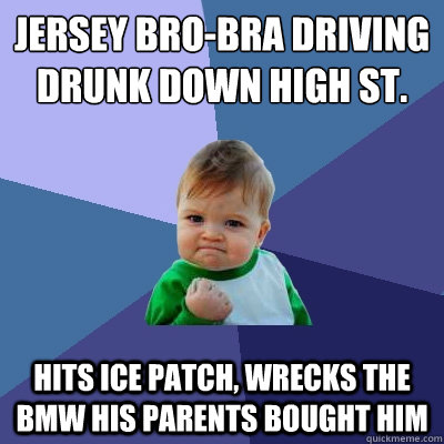 Jersey Bro-bra driving drunk down High St. hits ice patch, wrecks the bmw his parents bought him