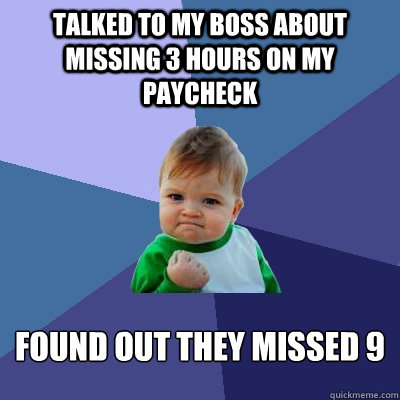 Talked to my boss about missing 3 hours on my paycheck Found out they missed 9