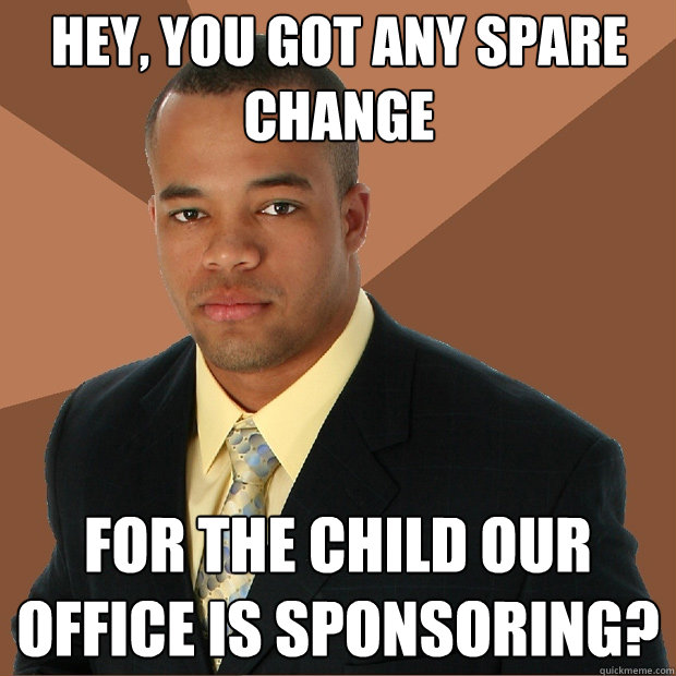 Hey, you got any spare change for the child our office is sponsoring?