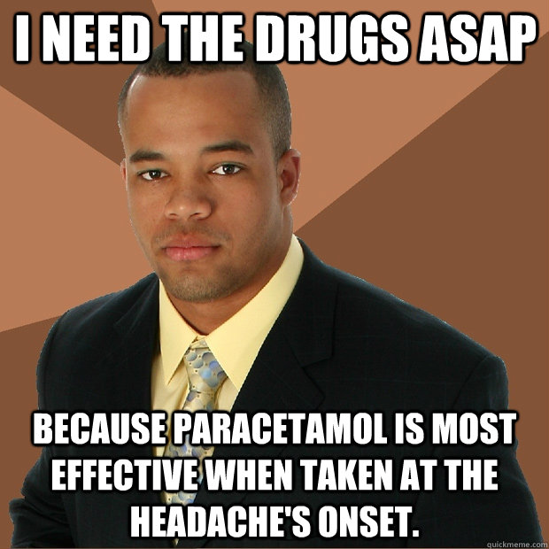 i need the drugs asap because paracetamol is most effective when taken at the headache's onset.