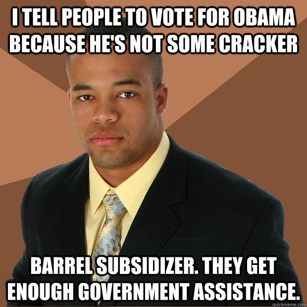 I tell people to vote for obama because he's not some cracker barrel subsidizer. They get enough government assistance.