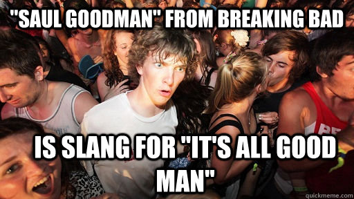 "saul goodman" from breaking bad is slang for "it's all good man"