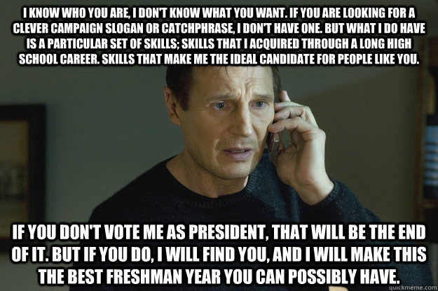 I know who you are, I don't know what you want. If you are looking for a clever campaign slogan or catchphrase, I don't have one. But what I do have is a particular set of skills; skills that I acquired through a long high school career. Skills that make