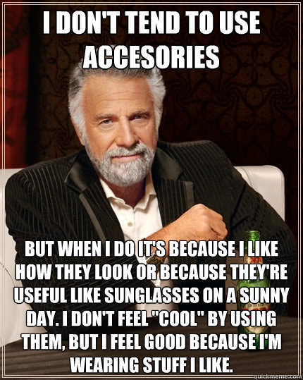 I don't tend to use accesories but when I do it's because I like how they look or because they're useful like sunglasses on a sunny day. I don't feel "cool" by using them, but I feel good because I'm wearing stuff I like.