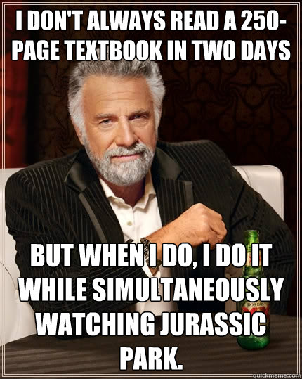 I don't always read a 250-page textbook in two days but when I do, i do it while simultaneously watching Jurassic Park.