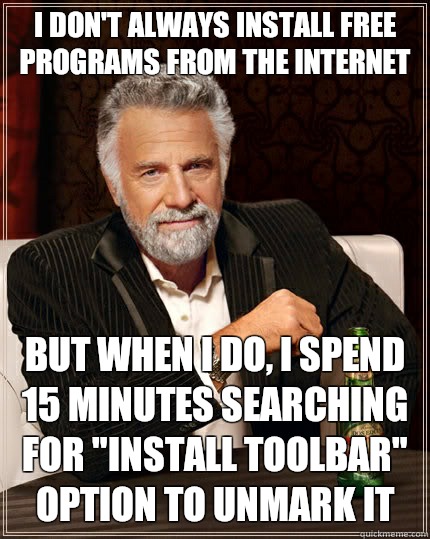 I don't always install free programs from the internet but when I do, i spend 15 minutes searching for "install toolbar" option to unmark it