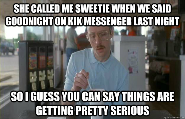 she called me sweetie when we said goodnight on kik messenger last night So I guess you can say things are getting pretty serious