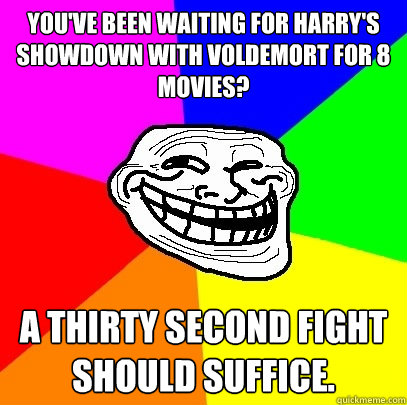 YOU'VE BEEN WAITING FOR HARRY'S SHOWDOWN WITH VOLDEMORT FOR 8 MOVIES? A THIRTY SECOND FIGHT SHOULD SUFFICE.