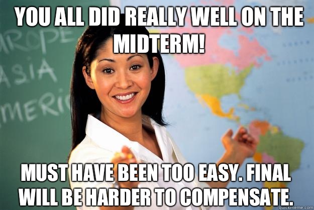 You all did really well on the midterm! Must have been too easy. Final will be harder to compensate.