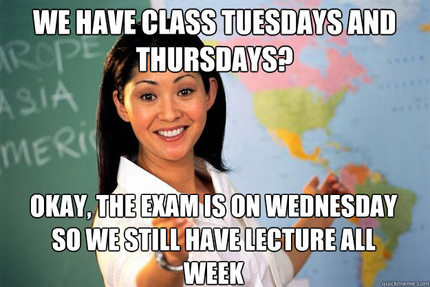 we have class tuesdays and thursdays? okay, the exam is on wednesday so we still have lecture all week