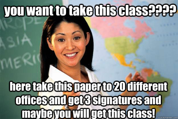 you want to take this class???? here take this paper to 20 different offices and get 3 signatures and maybe you will get this class!