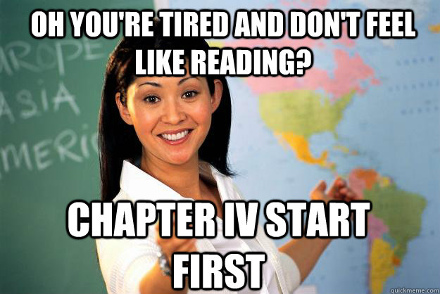Oh you're tired and don't feel like reading? Chapter IV start first